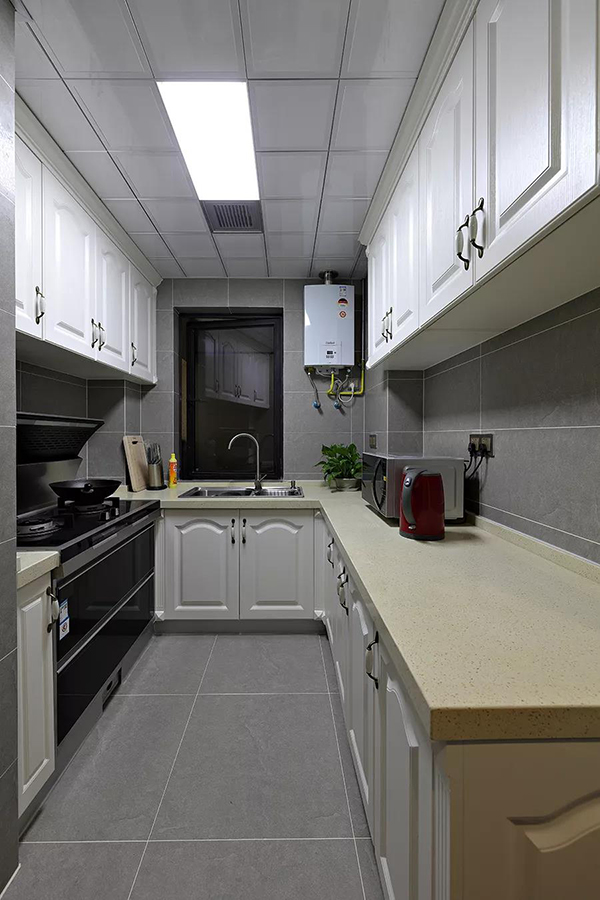 廚房采用了防污、抗腐蝕性能強(qiáng)的吊頂,中間嵌入一塊長條燈具與抽風(fēng)機(jī),十分實(shí)用。大理石的操作臺(tái)面,易清理又耐用,一般大小的廚房也能把各功能區(qū)分開來。