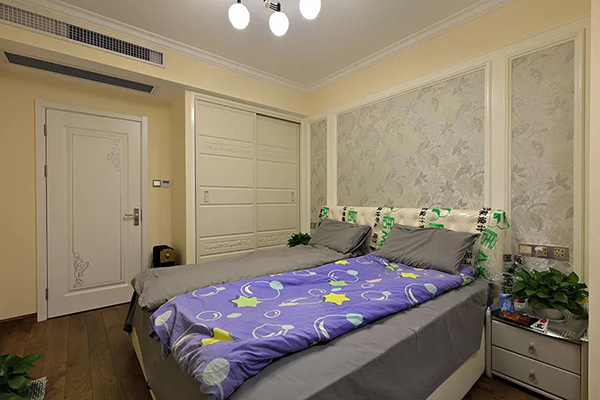中央空調(diào)保證主臥一年四季溫度適宜,床頭淺色的花紋背景墻紙,素色簡約,與床柜的綠植,讓臥室看起來既溫馨又不乏小清新。