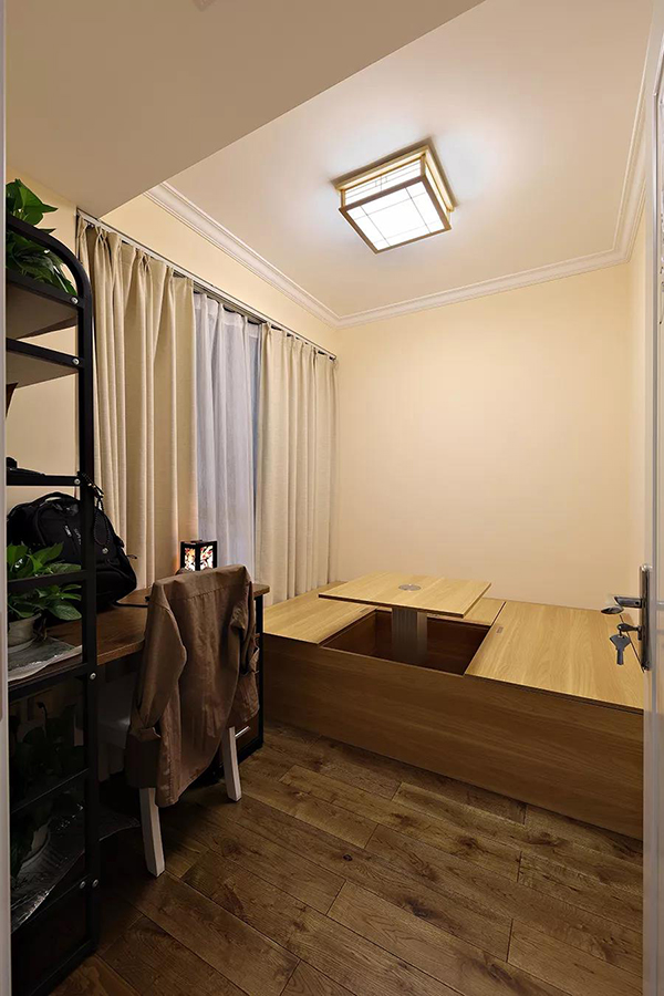 采用了升降式的榻榻米床,睡覺時(shí)從柜子里取出床褥便可休息,不睡覺時(shí),把床鋪收起,把隱藏的小桌子拉上來,就成了一個(gè)自由舒適的茶話室。