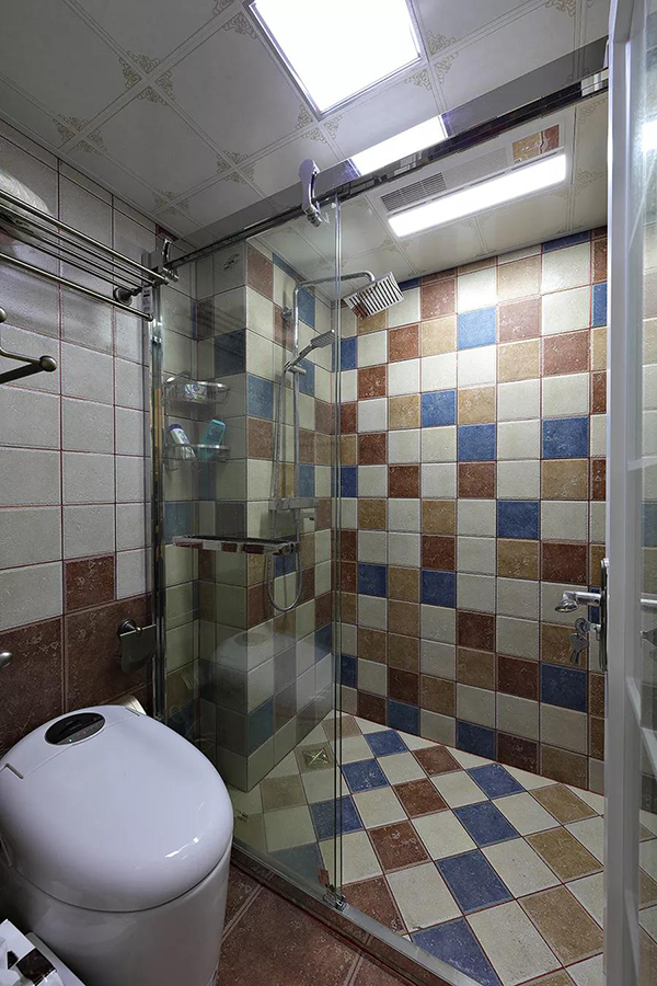 馬賽克瓷磚為淋浴區(qū)增添了田園風(fēng),而玻璃推門則表達(dá)現(xiàn)代時(shí)尚感,色彩斑斕的淋浴區(qū),讓業(yè)主在淋浴時(shí)悠閑自得。