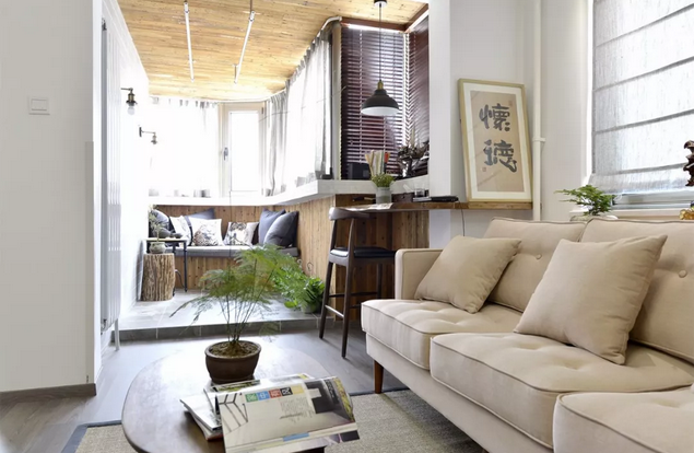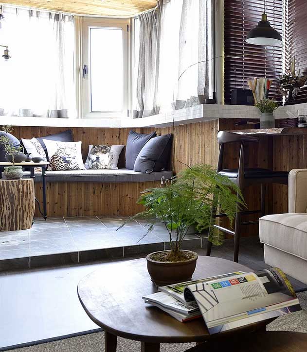 客廳溫馨且舒適,光線簡直成為了家中最亮堂的小天地,一大片的深色木質(zhì)書架,暴露了屋主喜歡看書的愛好,木質(zhì)椅,落地書燈,還有一個原生態(tài)木質(zhì)桌,不占地,還顏值高!