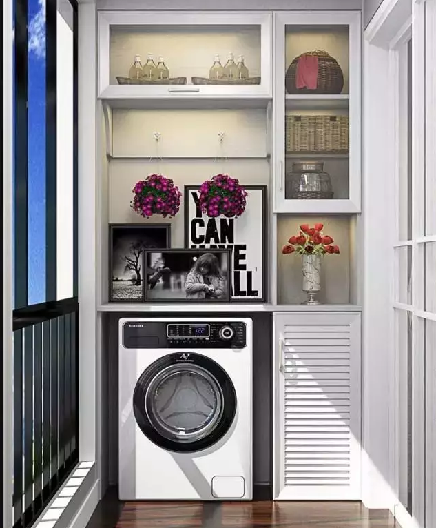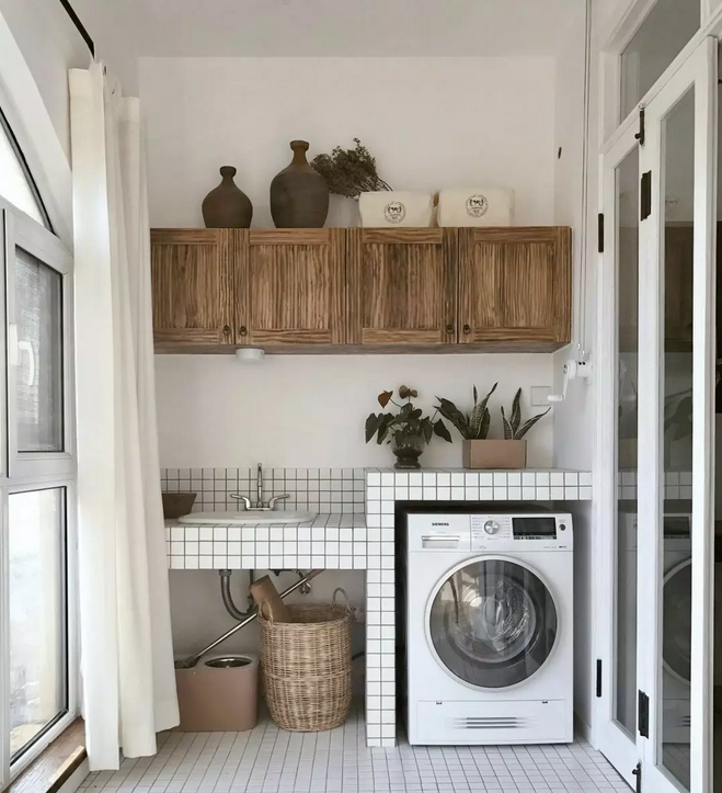 衛(wèi)生間面積不夠,或者覺得陽(yáng)臺(tái)放洗衣機(jī)比較方便的小伙伴 ,也可以考慮把洗衣機(jī)放陽(yáng)臺(tái),這樣洗完直接晾曬。