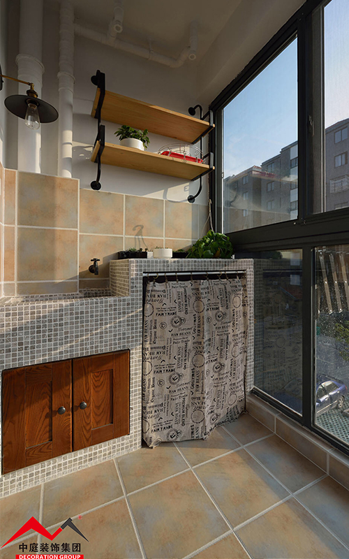 陽光照射地磚顯得陽臺(tái)更加溫暖,棕色的柜門凸顯,洗漱旁擺放著綠栽,給人起到了放松舒適的感覺。