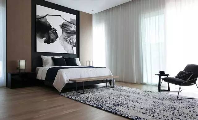 ▲床頭背景墻也被設(shè)計(jì)成木質(zhì)的,搭配衣服黑白的水墨畫后,別有一番意境。