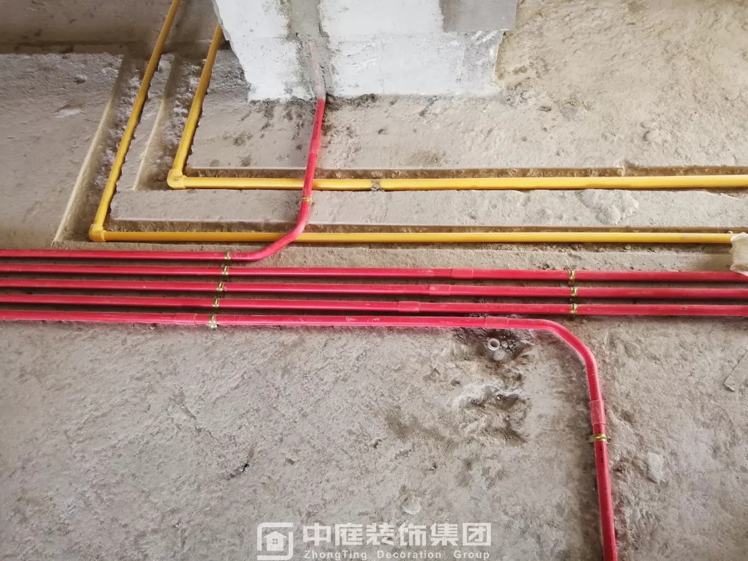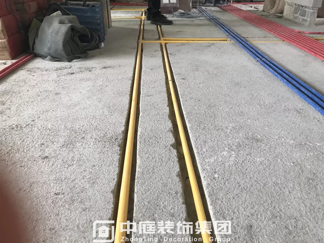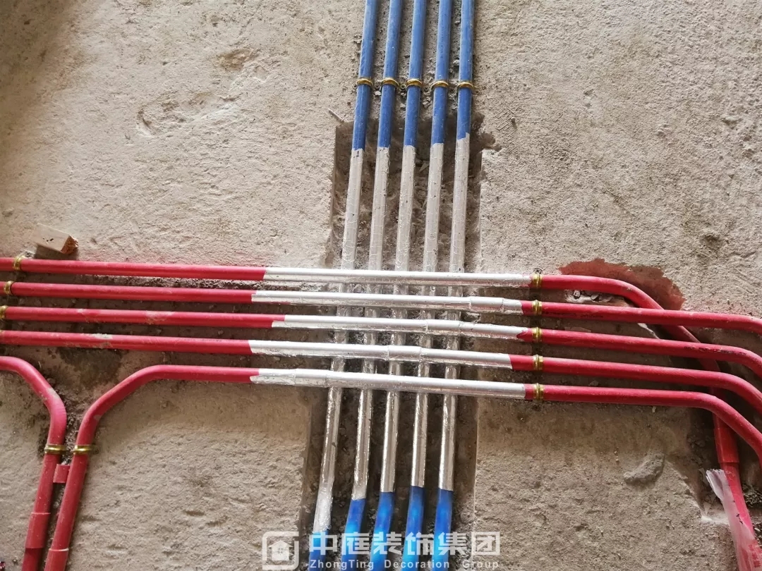 施工現(xiàn)場線管鋪設橫平豎直,按照集團施工規(guī)定使用鐵皮卡扣固定,管和管之間留有足夠縫隙,以便鋪設地磚時水泥砂漿進入管下,避免地磚后期出現(xiàn)空鼓;強弱電交匯處,用錫紙包裹保護,可以有效防止對弱電產(chǎn)生信號干擾。