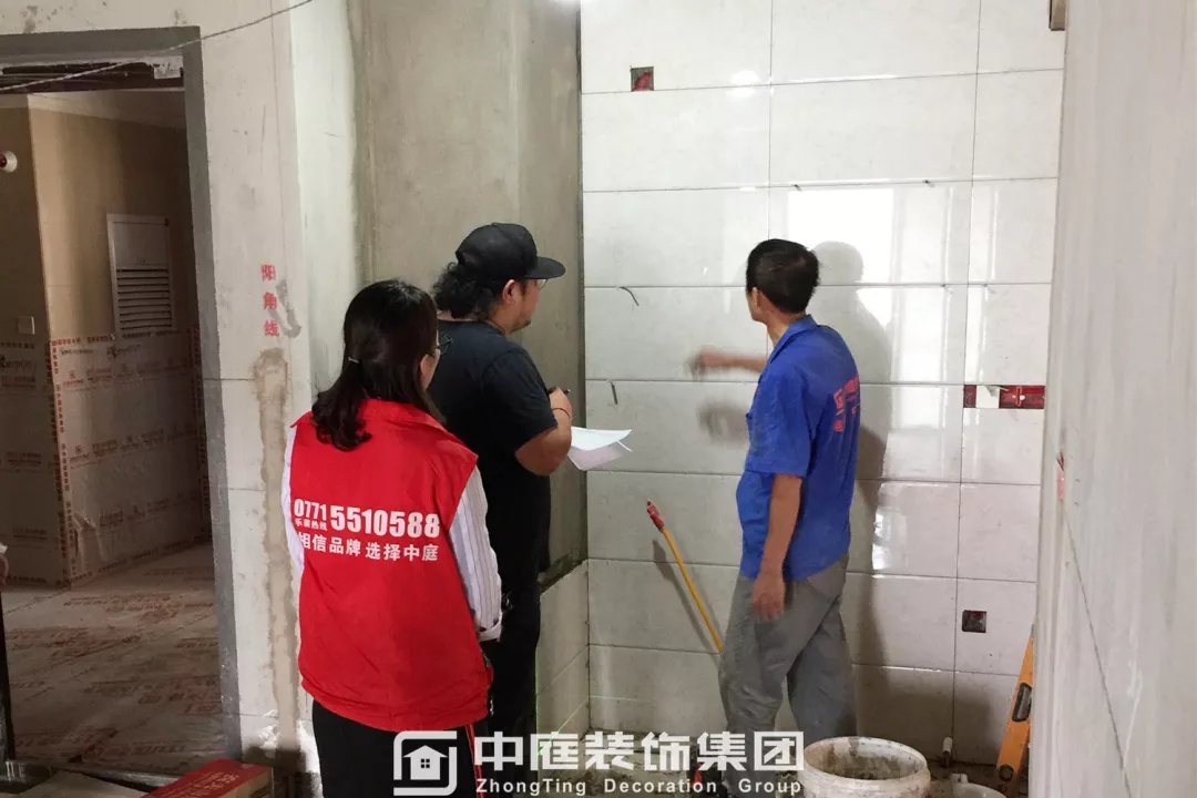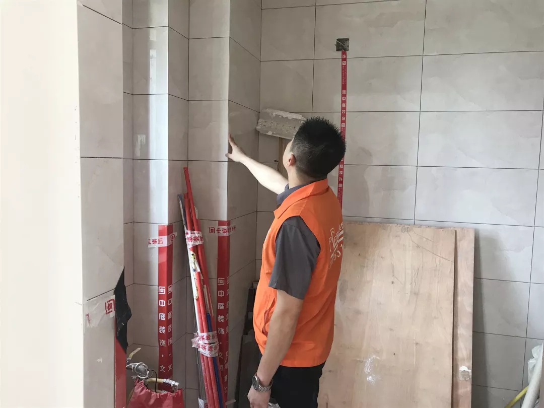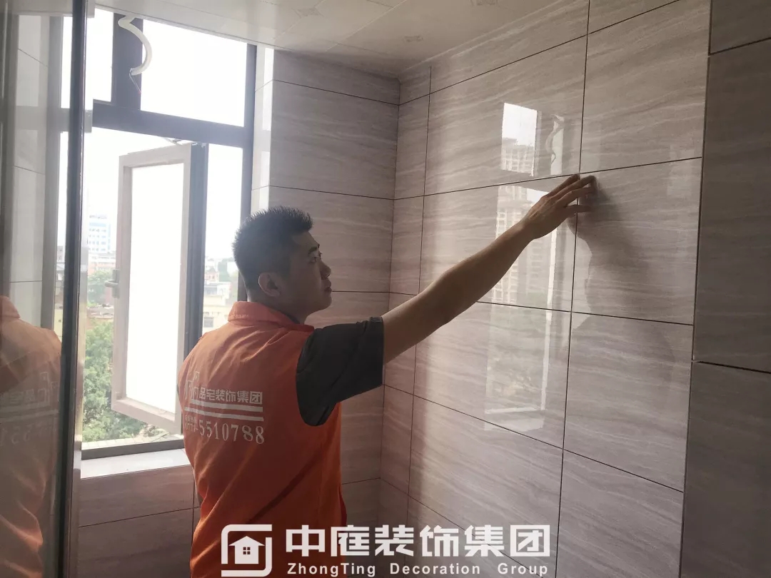 檢查瓷磚鋪貼的平整度是否達到集團施工標準