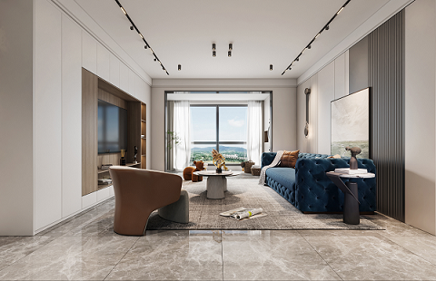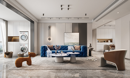 使用更親近自然的棉、麻、木搭配黑、棕、白、灰色,在裝飾上極度的克制,給人高品質(zhì),舒服的感受。削弱復(fù)雜造型和色彩對(duì)人情緒的影響,反而產(chǎn)生了治愈的力量??巳R因藍(lán)沙發(fā)的點(diǎn)睛之筆,顯得整個(gè)空間更加自信,給人傳遞高級(jí)的視覺感受。