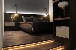 在臥室的臺(tái)階處制作地臺(tái),加燈帶氛圍烘托氣氛,做柜子有效隔開衣帽間獨(dú)立空間。